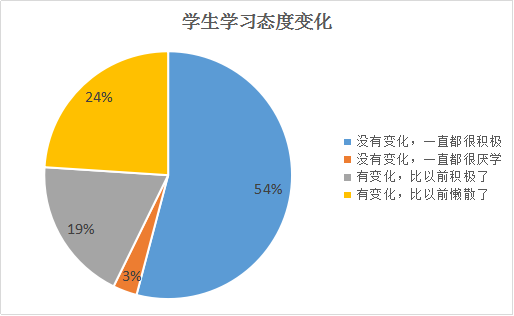 开展在线学习后,54%的同学学习态度并没有发生很大变化,他们对学习的热情一直处于积极状态,有19%的同学认为在线学习让他们比以前更积极了,但也有24%的同学认为在线学习使他们变得比以前懒散了: