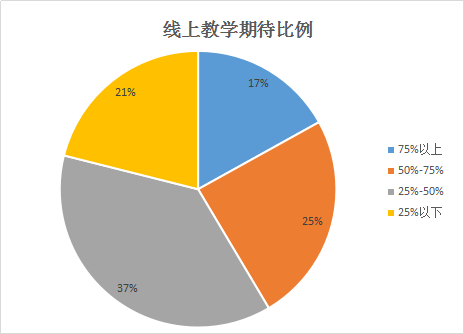 如果按照线上与课堂相结合的方式进行教学,那么员工预期的线上教学的比例占课堂教学的比例是多少呢?37%的同学认为线上教学占比为25%-50%合适,25%的同学们认为比例为50%-75%合适,21%的同学们觉得占25%以下合适,仅有17%的同学认为占75%以上合适: