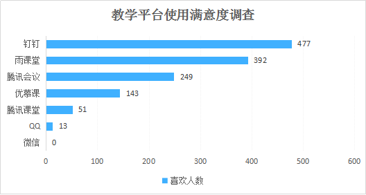 针对公司教师使用较多的七种教学平台我们做了一个满意度调查,员工喜欢程度由高到低分别是:钉钉,雨课堂,腾讯会议,优慕课,腾讯课堂,QQ,微信(无人选择)。