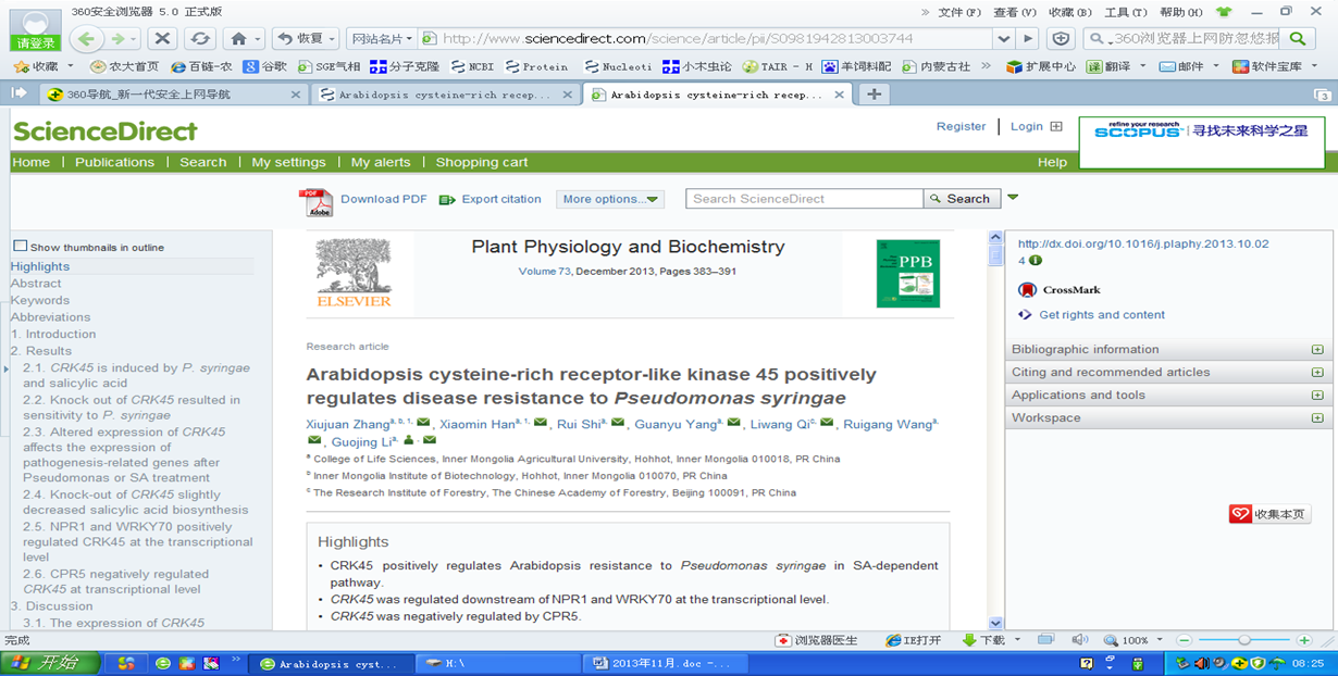 2013年10月28 日,公司植物分子生物学实验室在SCI 期刊 《Plant Physiology and Biochemistry》在线发表题为 “Arabidopsis Cysteine-rich Receptor-like Kinase 45 Positively Regulates Disease Resistance to Pseudomonas syringae”(DOI: 10.1016/j.plaphy.2013.10.024) 的文章,将于近期正式刊出。