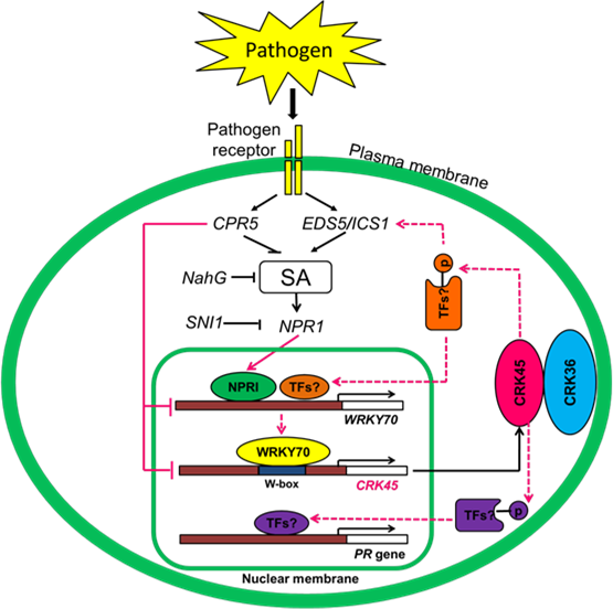 该文章报道了拟南芥富含半胱氨酸的类受体激酶家族成员之一CRK45参与了拟南芥中水杨酸(SA)介导的抗病信号途径。研究发现,CRK45过表达株系中抗病相关基因的表达水平上调,对丁香假单胞杆菌(Pseudomonas syringaepv. tomato DC3000)的抗性增强;相反,突变体crk45中抗病相关基因的表达量降低,对丁香假单胞杆菌的抗性减弱。同时,作者还发现对Pst DC3000敏感的npr1突变体和NahG转基因株系中CRK45的表达量下降;突变体wrky70中CRK45的表达量也被下调。这些结果表明,CRK45正调控植物抗病,并在转录水平受NPR1和WRKY70的调控。作者根据自己的研究结果和前人的研究证据,提出了CRK45在拟南芥依赖SA的抗病信号途径中的位置和可能的作用(见图1)。2013年3月,该实验室的文章曾报道了CRK45对拟南芥幼苗建成早期的调控作用。这两篇文章揭示了同一个基因在不同信号途径中的不同功能。