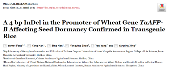 近日,公司伟德官方网站生物化学与分子生物学专业毕业的冯玉梅博士和2021级博士研究生韩洋作为论文共同第一作者,杨燕教授和邢燕平博士作为通讯作者在国际知名期刊《Frontiers in Plant Science》(植物科学领域Top期刊)发表了题为“A 4 bp InDel in the Promoter of Wheat Gene TaAFP-B Affecting Seed Dormancy Confirmed in Transgenic Rice”的研究成果。