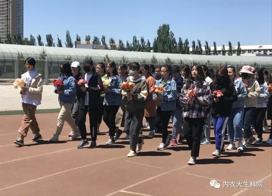 花束队由64名女同学组成,在工作人员的引领与指导下,她们手捧花束重复练习,力争将队伍走到接近完美,她们相互配合,听从指挥,即时改正错误。方阵队由64名男女同学共同组成,整齐划一的脚步,嘹亮的口号,都彰显了生科学子朝气蓬勃的精神面貌。