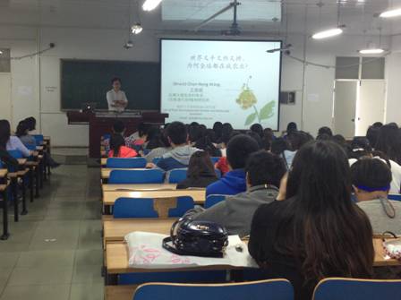 讲座中,王俊能博士利用多媒体课件,综合分析了全球社会、经济、环境、农业、食品与健康的现状与关联,探讨了生物学工作者在世界人口不断增加、自然资源逐渐耗竭、全球气候暖化、工业环境污染以及粮食生产成本攀升的现实情况下,如何在研究提升作物产量之外,师法自然、发展仿生,探索生物多样性在生技、医药、有机农业和生态减碳中的利用,从而探寻人类文明持续的未来出路。为与会师生上了一堂精彩的科普课。
