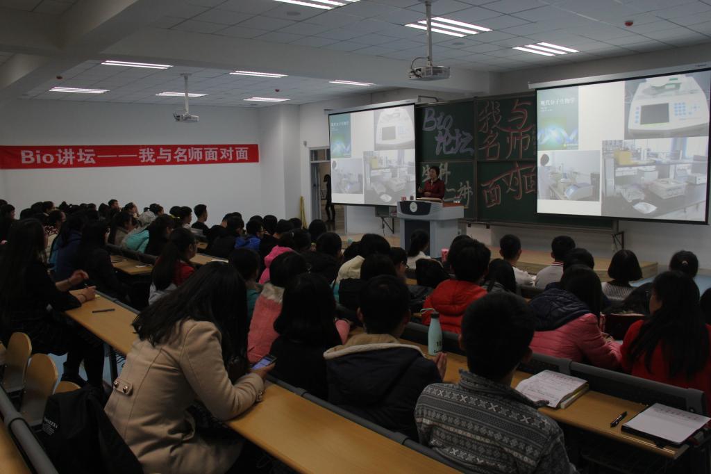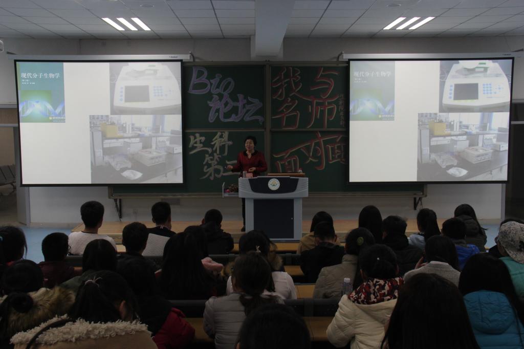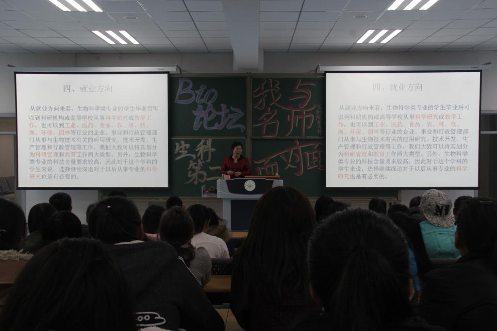 讲座伊始,张焱如教授首先做了自我介绍,接着向同学们讲述了生物专业近年来的发展历程,分析了就业前景,说明了生物专业各分支的研究方向,为同学们点亮了明灯。随着同学们的兴趣高涨,她又就专业培养要求及目标、专业教学计划、学科具体内容等方面做出了具体解释。同学们都聚精会神,仔细听讲。随后,她又对考研专业选择、生科生技的就业方向向大家做出了详尽的分析,极大地调动了同学们的学习兴趣。接着,她又详举了众多科研成果,强调了生物科学对人们生产生活所产生的重大影响。最后,张教授告诫同学们要利用好大学时光,鼓励他们努力学习、刻苦钻研,发扬中华民族艰苦奋斗、自强不息的精神。同学们满怀热情,认真聆听,聚精会神地汲取着知识的养分。