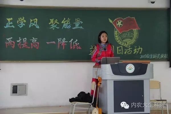 活动伊始,15生科民族班团支书策丽美格对于班级学习,生活基本情况进行了说明,使在座老师,员工全面了解了班级现状。随后,策丽美格代表全班同学针对班级挂科率太高做出检讨,深入分析了同学们在学习过程中出现的问题,并提出了未来的班级举措、理念和展望。同时,她代表全班同学宣读班级学风建设承诺书,并表示会争取带领全班响应“两提高,一降低”的要求,积极推进公司学风建设。