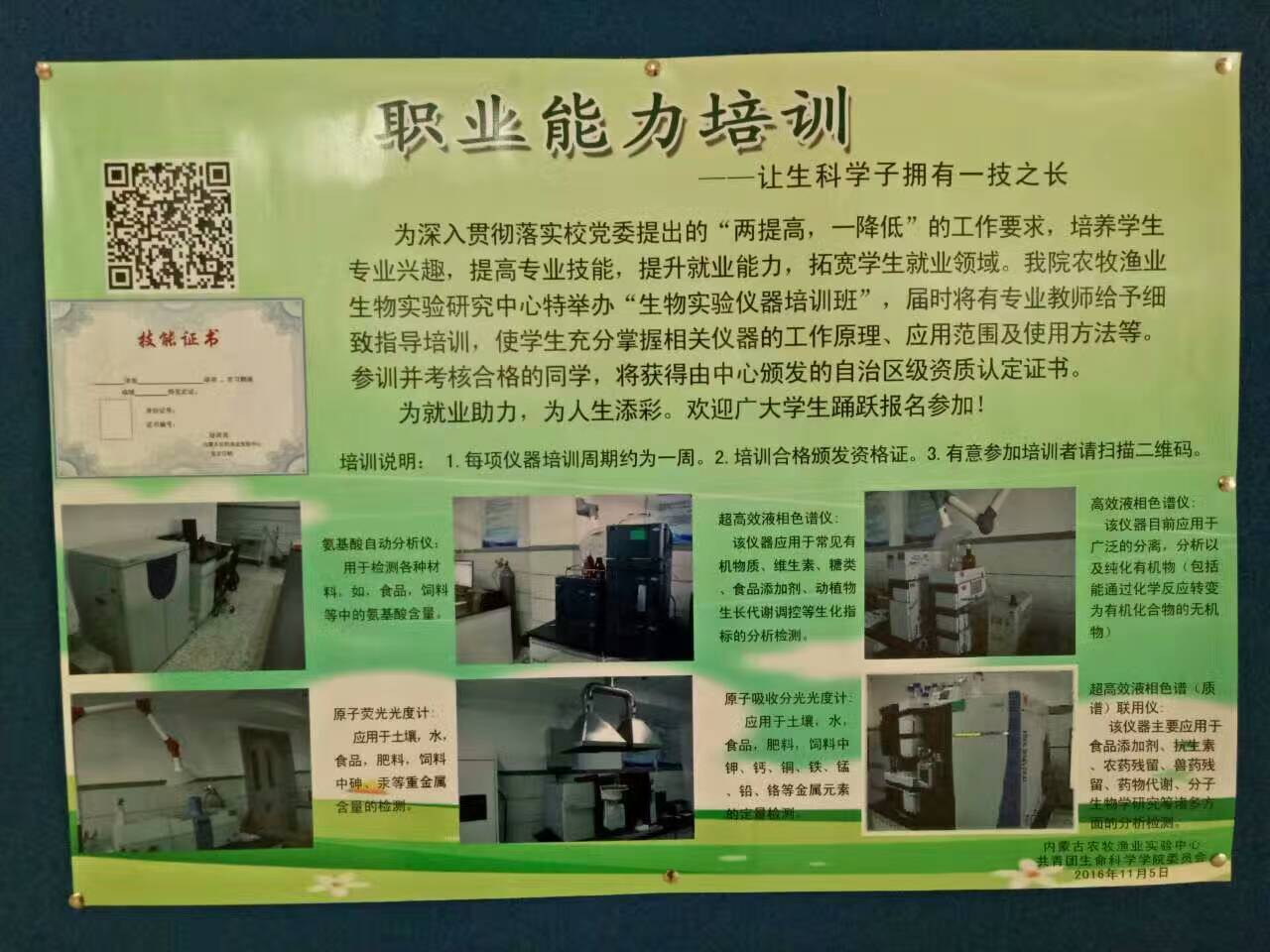 内蒙古农牧渔业生物实验中心是为公司教师的科研、博士、硕士论文提供测试分析服务的实验研究机构,也是本科员工教学、实习、培训的基地。中心通过开设培训班,邀请资深实验员对员工言传身教,将实验仪器的各项操作,维护方法进行细致讲解,使员工通过实践操作,在增加专业知识储备的同时掌握众多技术方法,为自己的就业之路拓宽发展方向,培训合格的员工也将获得自治区级资质认证书。