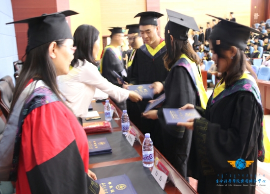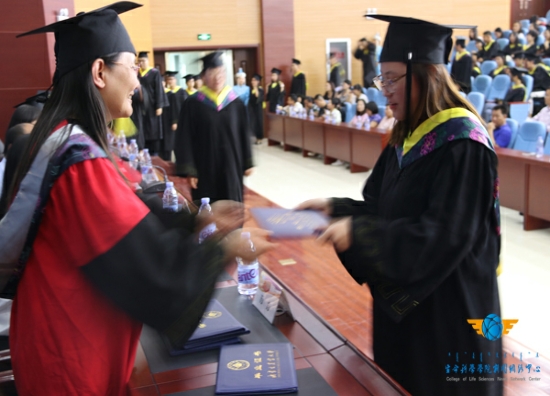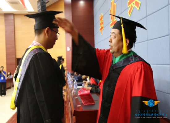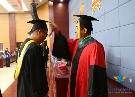 随后,由学位委员会主任,经理付和平为学士学位获得者拨穗,主席台就坐的领导,老师为学士学位获得者颁发证书,付经理将毕业生们的帽穗由右边拨到左边,向毕业生们致以祝贺和勉励,并与他们握手。拨穗仪式寓意麦穗已经成熟,象征着生科院的毕业生们已经学有所成,可以展翅高飞。