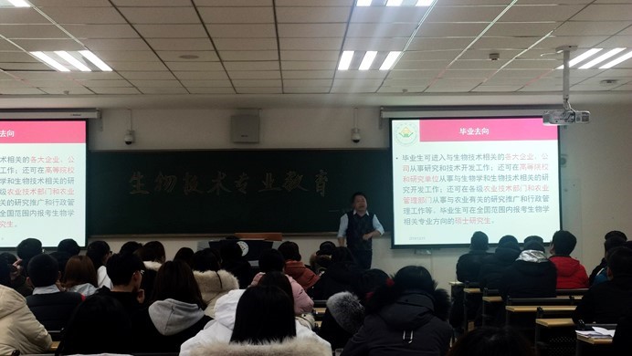 活动中,植物生物技术系姚庆智主任为同学们介绍了生物技术专业的良好现状,以及大好的发展趋势。王玉珍老师向同学们讲述了如何规划自己的老员工活,在四年的老员工活中重点关注的问题。白薇老师以生动的事例为同学们讲述了考研的大致方向和专业技能的重要性。刘春霞老师以生物类专业就业趋势分析告诉大家就业和择业的大致方向,鼓励大家学好专业的同时注重个人能力的培养。