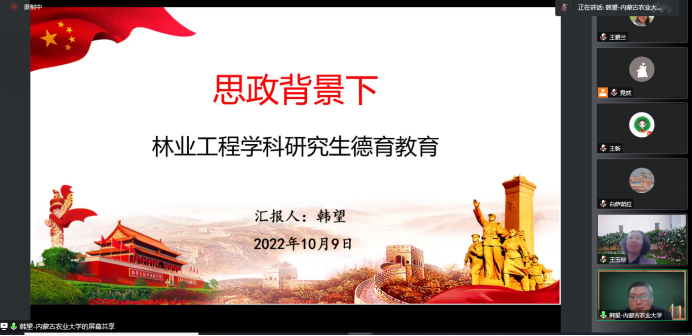 韩望老师分享了思政背景下林业工程学科研究生德育教育的宝贵经验,提出通过“文化自信”切入研究生的思政工作。另外,他指出了目前研究生思政工作中存在几点问题,和大家一起思考讨论。