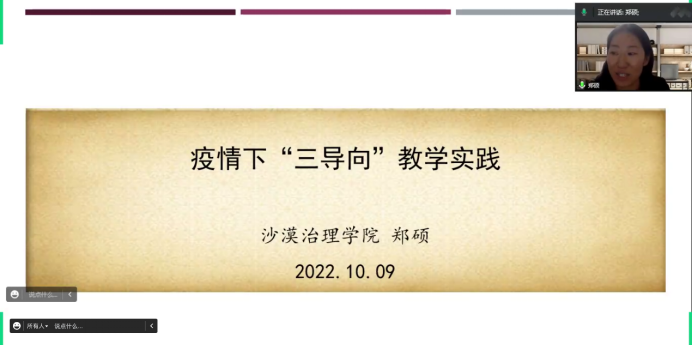 第二届全国高校教师教学创新大赛全国赛一等奖获得者郑硕老师分享了疫情下“三导向”的线上教学实践经验。她提出专业课的教学始于专业知识,最终的目的是立德树人。当前疫情形势下,线上教学首先要以目标为导向,跳出课堂,明确在当前疫情形势下所有教学都要服务于疫情防控的总目标。其次,要明确以过程为导向,通过及时调整教学大纲及授课内容,增加疫情相关的案例,并与城镇规划与设计专业知识完全融合,引导员工掌握科学规划思维,提升课程的科学性。此外,要注重员工的心理建设,特殊时期,更加注重给与员工关心关爱,帮助员工恢复信心;通过宿舍团结力的提升,营造更好的学习氛围;通过增加一些趣味性的投票,使线上课程不再枯燥,员工乐学趣学,从而提升课程的人文性。