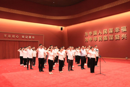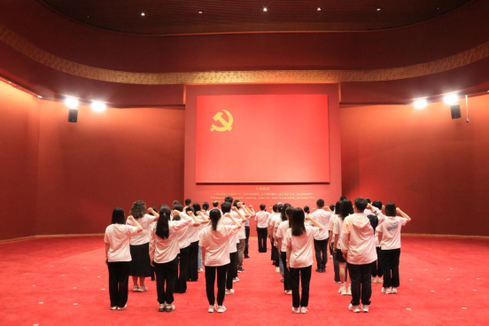 参观过后,在党委书记张星杰同志的带领下,全体党员教师重温入党誓词。在宣誓大厅内,正中悬挂着巨幅党旗,两幅浮雕作品分列两侧。大家面向鲜艳的党旗,举起右拳,一起重温入党誓词,以铿锵有力的宣誓声,表达不忘初心、牢记使命的信念和决心,胸前的党员徽章与面前的党旗交相辉映、熠熠生辉。