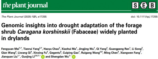 近日,伟德官方网站旱寒区植物逆境适应与遗传修饰改良自治区重点实验室李国婧教授团队与兰州大学武生聃研究员、刘建全教授及浙江大学陈铭教授等团队合作,在国际知名植物学期刊《The Plant Journal》上发表了题为“Genomic insights into drought adaptation of the forage shrub Caragana korshinskii (Fabaceae) widely planted in drylands”的研究论文,解码了柠条的染色体水平参考基因组序列,搭建了组学数据库平台,揭示了其适应极端干旱生境的遗传基础。内蒙古农业老员工命科学公司研究生杨天瑞和兰州老员工态公司研究生梅峰源为论文共同第一作者。