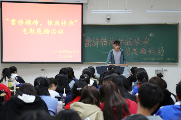 为学习雷锋精神,弘扬志愿情怀,争做新时代“有理想,有道德,有文化,有纪律”的四有青年。3月20日晚,生科院第二十届团委员工会组织部于南教A113举办“雷锋精神,你我传承”电影展播活动。第二十届团委员工会组织部部长吴海杰跟进活动,生科院各级同学积极报名观看。