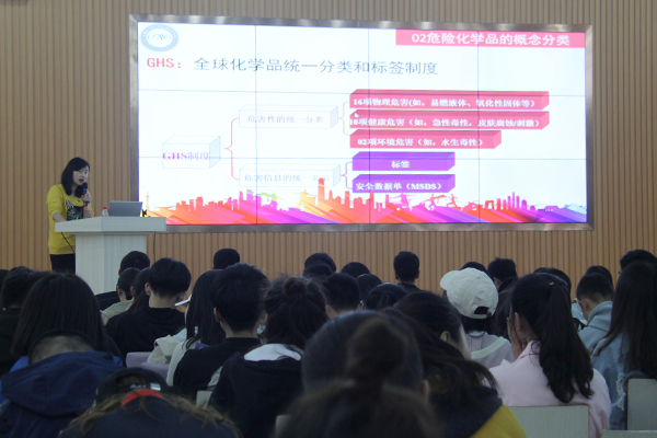活动伊始,主讲人武春燕进行自我介绍。武老师将讲座内容分为典型实验室事故案例分析、危险化学品的概念分类、危险化学品标识、实验室急救措施和实验室安全准入系统五个方面。活动过程中,老师说明了在本学期进行实验室安全培训是为了同学们进实验室做准备,进而引入到实验室事故案例分析,并通过简明扼要的介绍让同学们对其他四个方面有了基本的认识。同学们与老师积极互动,现场气氛活跃。活动最后,武老师再次强调要关注实验室安全,关注生命安全,对同学们给予新学期的鼓励与祝福,活动在同学们热烈的掌声中圆满结束。