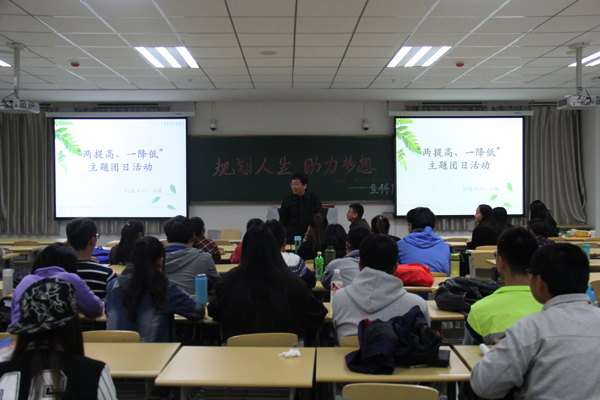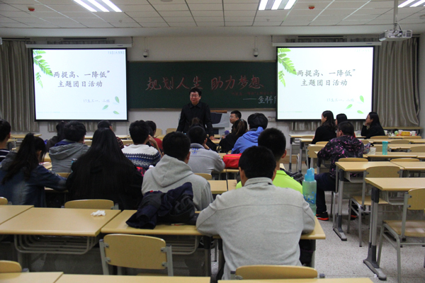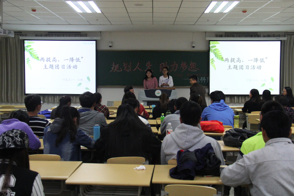 活动伊始,15生工一班团支书白嵘、生工二班团支书张婷婷致辞并感谢到场嘉宾。随后,林宝书记作为两班班主任讲话,他说:"老员工应该有理想、有抱负、有作为,不能将青春奉献在手机上、被窝里,要好好学习。"接着还谈到关于生物工程的相关知识、互联网+等热门学术知识,激励大家好好学习,实现零挂科。接下来李万春老师为大家解释"两提高、一降低"的含义、提出目的、具体措施及意义,希望大家积极响应公司号召,建设优良学风。紧接着,杨毅老师讲到如何利用慕课共享全国乃至全球的优秀教学资源,鼓励大家网上学习,以及讲述他的得意门生,引导同学们见贤思齐,规划好大学,规划好人生。之后,研究生刘梦、大四员工米丽媛分别和大家讲解关于考研的学习方法及经验、并与大家分享了她们学习路上激励自己继续前进的故事,以此鼓励大家努力学习。