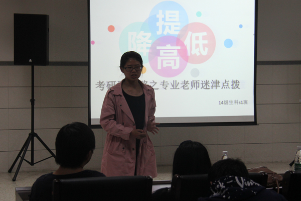 为了使员工深入了解最新的考研动态,全面备战考研,切实提高考研率,积极落实“两提高,一降低”的学风建设要求。生科院14级生科S1班于10月25日晚上7:00在生科楼418举办了“两提高,一降低”主题团日活动,公司生物化学与分子生物学教研室教授赵国芬,抗肿瘤药物技术系教授万方应邀担任主讲,生科专业全体员工参加本次讲座。