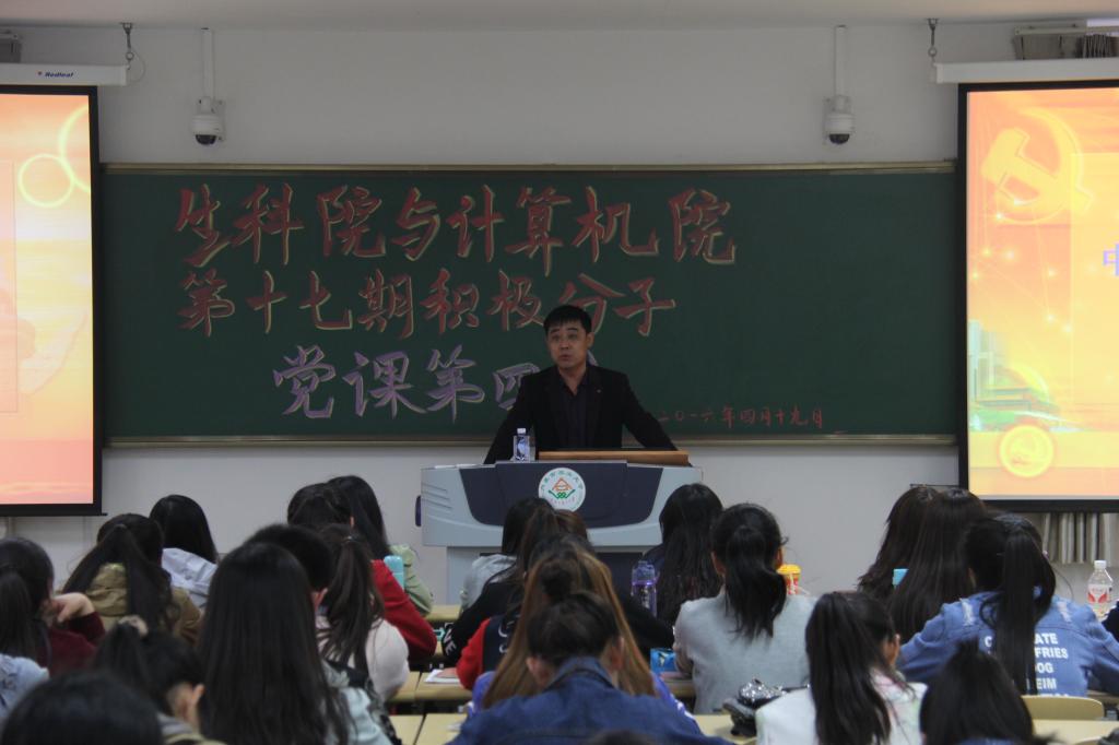 为了使生科院第十七期入党积极分子更加了解中国特色社会主义的领导核心。4月19日晚上7:00,公司于南教A223举行生科院与计算机院第十七期党课培训班。本次党课由刘瑞鹏老师主讲。