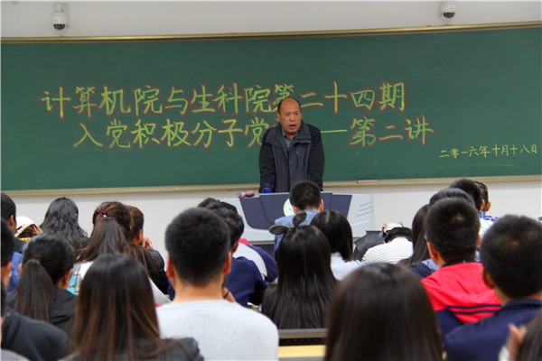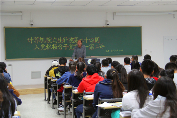 10月18日晚上7:00,“生科院与计算机院第二十四期入党积极分子党课---第二讲”于南教A322教室成功召开。人文院张建兴老师主讲,生科院与计算机院全体积极分子参加此次党课。