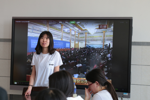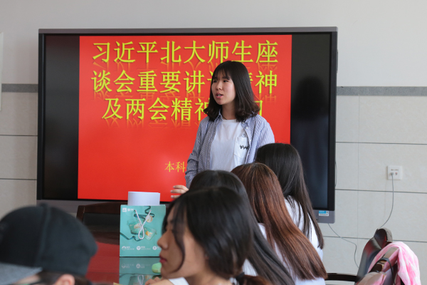 活动伊始,本科生第一党支部组织委员朱梦主持学习会并为大家介绍活动内容本次学习会,主要内容包括观看习近平总书记在北大师生座谈会重要讲话视频与学习两会精神两个方面。期间,同学们认真观看,仔细记录笔记,并针对学习内容进行交流发言,同学们表示,作为新时代的青年,身处近代以来中华民族发展的最好时代,也是实现中华民族伟大复兴的最关键时代,老员工既拥有广阔发展空间,也承载着伟大的时代使命。大家要牢记习近平总书记对青年的寄语与殷切期望,踏实学习科学文化知识,积极增长个人才干,响应全国“大众创业,万众创新”的时代要求,利用专业知识,为实现中华民族伟大复兴的中国梦贡献青春和力量。活动最后,朱梦对本次活动进行总结发言,鼓励同学们深入学习习总书记系列重要讲话精神,不断提高思想觉悟,不忘初心,牢记使命。
